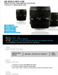 시그마34 [SIGMA 105mm F2.8 EX DG MACRO OS]누가 인물렌즈라 했는가.. 무려 5개월의 긴 잠에서 깬 개봉기 및 사용기 되시것다...바쁘면 좋은거라 했지만 돈버는데만 바쁘면 멍해 집니다.지난 6월에 구매해서 D810과 함께.. 실은 D300이를 이용하려 했으나 방출해서 이젠 D810과함께 동거동락(조만간 지름신 예고)하게 된 렌즈 하나 소개 시켜 드립니다. SIGMA 105MM F2.8 EX DG MACRO OS 렌즈를 소개해 봅니다.카드 결재후 바로 배송... 거기에 엄청난 포장으로 얼마나 크게 오나... 했더니 박스만 ㅋㅋ 행사기간이라서 62mm 시그마 필터도 딸려 옵니다. 구성품은 매뉴얼, 보증서, 파우치, 렌즈, 후드1,2 정도? 라 보시면 됩니다.각종 사이트 및 블로그에 스팩은 있으니 패스해 봅니다.솔직히 그런거 별로 적기 싫습니다. D810에 마운트한 모습이죠.. .. 2018. 11. 29. 포커싱 테스트 용지(핀테스트용지) 카메라 초점테스트 용지를 배포합니다. 뭐 다들 잇으시지만 요즘들어 찾는 분들이 계시네요. 여기를 누르시면 >>>> 포커스테스트요령 이미지를 클릭해서 받으세요. 2015-09-19 2015. 9. 19. [SIGMA]SLR CLUB과 함께하는 시그마 85mm F1.4를 잡아라 뭐... 오랜만에 나와있는 광고!!! ㅎㅎㅎ 벌써부터 클럽에는 난리가난 댓글들.. 난 여친도 없으니 뭐.. 찍어봐야 소용도 없지만.. 그래도 탐나는 렌즈인데... 9월말 입고가 가능하다고 하니.. 너무 늦는건 아닌가 싶네요. 조만간 지름신이 오는 렌즈중 하나일듯... 자세한 이벤트는 아래 주소를 클릭하세요!!! http://www.slrclub.com/bbs/vx2.php?id=event&page=1&divpage=1&ss=on&select_arrange=headnum&desc=asc&no=307 2010-09-07 2010. 9. 7. [SIGMA]APO 50-500mm F4-6.3 APO EX DG [HSM] 신제품 출시 렌즈구경하기1 렌즈구경하기2 Sigma에서 새로운 렌즈를 라인업했습니다. 지난 4월1일 만우절에 공지를 냈으나.. 뜬구름인줄 알았죠^^ 이벤트도 하는데 대단하네요.. 현재 나와있는 DSLR과 모두 호환이 가능하다고 합니다. "렌즈구경가기"를 클릭하시면 해당 Site로 이동하게 됩니다. 2010-04-08 2010. 4. 8. 이전 1 2 3 4 ··· 9 다음